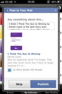 this new world of mobile reading isn’t going to fade away – the rise of the mighty kindle has proved that – and ether will have more to offer as time goes on. this week they announced that, as well as short stories, essays and serials, you can also download weekly columns by well-established writers and journalists via the ether app. plus ether will, sooner rather than later, be available on android and blackberry too. the ether universe is expanding. so come on, get involved. before everyone starts laughing at you more than they already do. sorry. shouldn’t have mentioned that. it’s nothing, honest.
